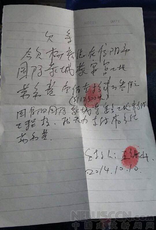 在相關工作同志的介紹下,記者和信陽毛尖集團有限公司負責宣傳的一位同志取得了聯(lián)系。據(jù)他講,他并不清楚這件事情,但他聽說并不拖欠農(nóng)民工工資,他們建設單位應該是足額支付給了建筑公司,建議記者和承包該工程的建筑公司聯(lián)系一下。記者隨即撥通了給農(nóng)民工打下欠條的王繼山的電話,他所在的公司是河南省信陽市北晨建筑安裝有限公司,而該公司正是信陽國際茶城的施工單位之一。據(jù)王繼山講,農(nóng)民工手中的欠條確實是他寫的,他也是事出無奈,因為建設方也沒有給他們工程款,他也沒有能力支付農(nóng)民工工資。據(jù)他講,該建設方欠他九百多萬元,他也正在抓緊找信陽毛尖公司。