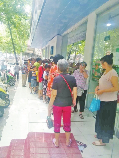 昨天下午3時(shí),記者再次來(lái)到這家大藥房時(shí),發(fā)現(xiàn)在門(mén)口排隊(duì)的老人有近百人。天氣炎熱,老人們大多帶著扇子和折疊凳,坐在藥房門(mén)前的臺(tái)階上排隊(duì)等候。