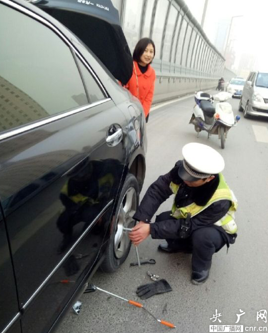 央廣網(wǎng)河南分網(wǎng)消息 這兩天鄭州氣溫驟降,早上都在零度以下,寒冷的天氣卻不乏暖心的事兒!網(wǎng)友爆料:早起走隴海高架西向東,發(fā)現(xiàn)過了紫荊山就小擁堵,到隴海醫(yī)院位置發(fā)現(xiàn)原來是一個交警在給一輛私家車換輪胎!天冷心不冷啊!這是誰家的交警同志,給他一百個贊!