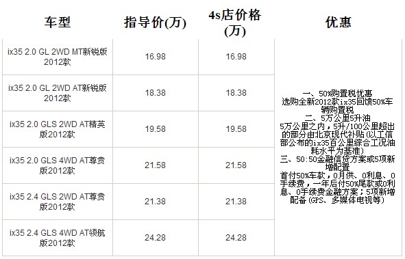 近日,筆者從北京現(xiàn)代汽車(chē)經(jīng)銷(xiāo)商處了解到,目前店內(nèi)IX35現(xiàn)車(chē)銷(xiāo)售,購(gòu)車(chē)可享3.5行動(dòng)帶來(lái)的受更多優(yōu)惠:1、50%購(gòu)置稅優(yōu)惠,選購(gòu)全新2012款ix35回饋50%車(chē)輛購(gòu)置稅;2、5萬(wàn)公里5升油,即5萬(wàn)公里之內(nèi),5升/100公里超出的部分由北京現(xiàn)代補(bǔ)貼(以工信部公布的ix35百公里綜合工況油耗水平為基準(zhǔn));3、50:50金融信貸方案或5項(xiàng)新增配置,首付50%車(chē)款,0月供、0利息、0手續(xù)費(fèi),一年后付50%尾款或0利息、0手續(xù)費(fèi)金融方案;5項(xiàng)新增配備(GPS、多媒體電視等)