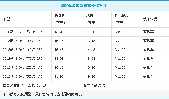 央廣網河南分網消息 據新浪汽車報道:近日,編輯從北京地區(qū)東風日產4S店了解到,節(jié)后2012款逍客的優(yōu)惠幅度為2萬元,其中1.6XE 風 5MT 2WD 售11.98萬元,2.0XV 龍 CVT 4WD 售19.98萬元。據銷售人員介紹,目前店內的逍客有現車,具體各款車型的報價和優(yōu)惠情況請參照下表: