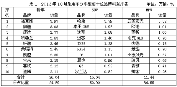 1-10月,乘用車共銷售1445.51萬輛,同比增長14.99%。其中:基本型乘用車(轎車)銷售970.51萬輛,同比增長11.37%;運動型多用途乘用車(SUV)銷售237.27萬輛,同比增長47.92%;多功能乘用車(MPV)銷售100.32萬輛,同比增長1.5倍;交叉型乘用車銷售137.41萬輛,同比下降25.45%。