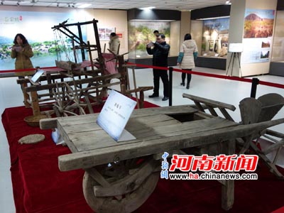 鶴壁古村落影片展展出的獨(dú)輪車及傳統(tǒng)村落生活生產(chǎn)用具。付淵博/圖