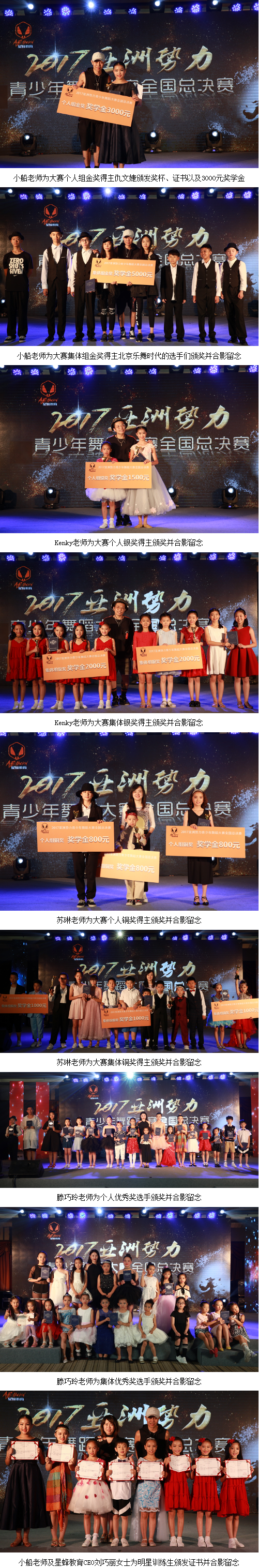 本次大賽從最初籌備到各地區(qū)初賽、復(fù)賽歷經(jīng)兩個(gè)多月時(shí)間,當(dāng)天,來自全國(guó)各地眾多優(yōu)秀的小選手們?yōu)楝F(xiàn)場(chǎng)觀眾獻(xiàn)上了一場(chǎng)活力四射的舞蹈盛宴。大賽最終評(píng)選出個(gè)人組和集體組的金、銀、銅獎(jiǎng)項(xiàng),同時(shí)還評(píng)選出優(yōu)秀編導(dǎo)獎(jiǎng)、最佳創(chuàng)意獎(jiǎng)和最佳組織獎(jiǎng)以及星蜂明星訓(xùn)練生等特別獎(jiǎng)項(xiàng)。