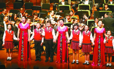 二〇一五年九月二十二日,中國國家交響樂團(tuán)攜手重慶市南岸區(qū)迎龍鎮(zhèn)北斗村農(nóng)民管樂隊(duì)、重慶特殊教育中心(盲童學(xué)校)揚(yáng)帆管樂團(tuán),在國家大劇院上演“最好的未來”夢想公益音樂會。圖為藝術(shù)家和盲童們演唱《我的祖國》。光明圖片/視覺中國