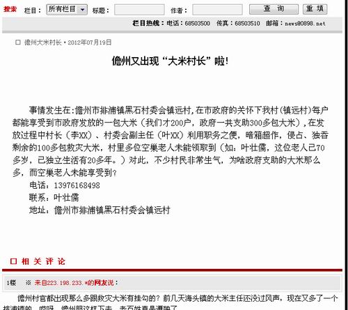 7月19日,有人在人民網(wǎng)海南視窗的“百姓聲音”一欄里發(fā)了一篇《儋州又出現(xiàn)“大米村長”啦!》的帖子,至記者7月22日晚上7時截稿時,點擊率達(dá)到了878次。該帖子并公布了反映人姓名及電話。