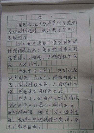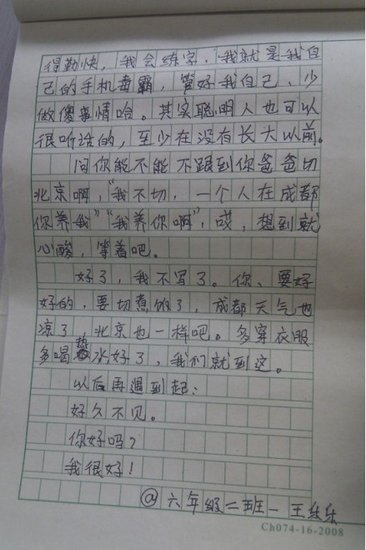 這篇被網(wǎng)友稱為“史上最感人告白”的作文里,成都的六年級(jí)小學(xué)生王樂樂喜歡班上一個(gè)叫“菜菜”的女生,“5·12”大地震時(shí),樂樂拉著菜菜的手逃出地震現(xiàn)場。但六年級(jí)畢業(yè)后,兩人卻面臨離別,女生要和父母去北京。