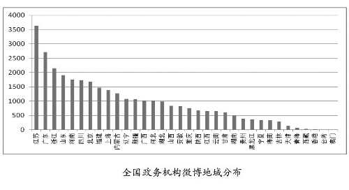 而全國政務(wù)微博總數(shù)超過3000個(gè)的省份只有4個(gè):江蘇、河南、廣東、北京。