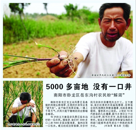 7月20日,媒體刊發(fā)《5000多畝地沒有一口井》一文,對南陽市臥龍區(qū)岳東溝村農(nóng)田旱情嚴重,農(nóng)民渴盼救苗水一事進行了報道,受到社會廣泛關(guān)注。為更快解決岳東溝村抗旱難的問題,記者到現(xiàn)場進行了采訪,并采訪了省水利廳有關(guān)負責(zé)人。