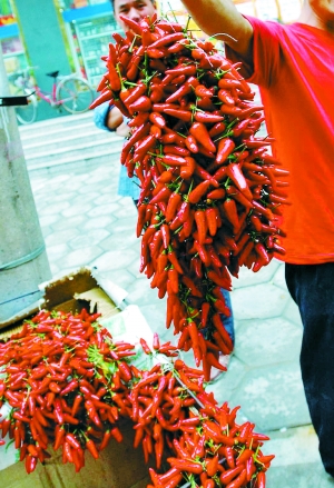 “看到這么鮮亮的辣椒穿成串,遠看還以為是工藝品呢!要不是親手摸摸,真不敢相信這是鮮辣椒!”市民張女士在親手摸了辣椒后,問起了價格。