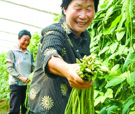 中廣網(wǎng)河南分網(wǎng)消息 據(jù)河南日?qǐng)?bào)農(nóng)村版報(bào)道:6月14日,湯陰縣伏道鎮(zhèn)天平蔬菜合作社社員正在采摘無(wú)公害長(zhǎng)豆角。日前,湯陰縣伏道鎮(zhèn)大棚無(wú)公害長(zhǎng)豆角喜獲豐收,該鎮(zhèn)采取大棚西瓜科學(xué)套種豆角的立體綠色種植技術(shù),長(zhǎng)豆角低殘留、無(wú)公害,每畝棚可產(chǎn)豆角1000余斤,畝均增收2600余元。