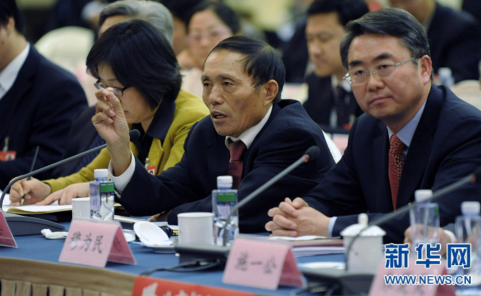 全國人大代表李連成(前中)是河南省濮陽縣西辛莊村黨支部書記,他的雄心壯志是把西辛莊村建成中國首個“村級市”。他說,我們建“村級市”,就是就近城鎮(zhèn)化,可以減少城市的壓力,也能縮小城鄉(xiāng)差別,讓農(nóng)民享受到和城市一樣的生活便利。(新華社記者 李博攝)