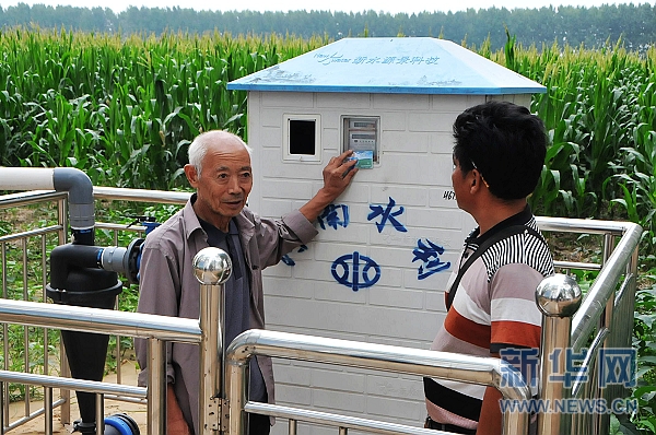 長(zhǎng)葛市古橋鄉(xiāng)董天龍村村民高根樹(shù)(左)拿著“農(nóng)業(yè)用水智能卡”,在地頭智能化井房刷刷卡澆地(8月5日攝)。新華社記者 黃冠 攝