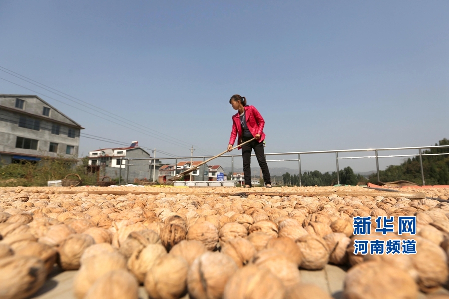 央廣網(wǎng)河南分網(wǎng)消息 2015年10月5日,河南省林州市東崗鎮(zhèn)東崗村農(nóng)家婦女任菊香利用晴好天氣在晾曬薄皮核桃,今年她家種植的60棵“清香2號(hào)”薄皮核桃全部豐收,干果的銷售將為她帶來(lái)萬(wàn)元收入。