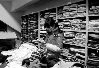 超市里,一位同學(xué)正在清點愛心衣物。