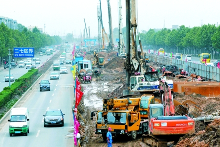 南三環(huán)現(xiàn)狀: 目前京廣路—京廣鐵路線段正在施工,772根樁基已完成40%。 記者 許俊文 圖