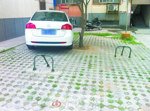 昨日,記者來(lái)到位于九都路上陽(yáng)路交叉口南200米的上陽(yáng)花園,發(fā)現(xiàn)路邊被固定著許多車位鎖,雖然綠化帶被鋪上了植草磚,但磚孔中的綠草已經(jīng)不見(jiàn)蹤影。