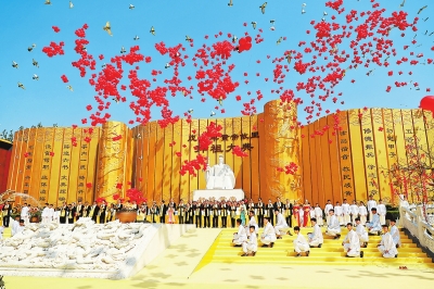 來自30多個國家和地區(qū)的華人華僑以及國內(nèi)社會各界人士近萬人參加了當(dāng)天的拜祖大典。(記者 朱殿勇 徐建勛 李點)