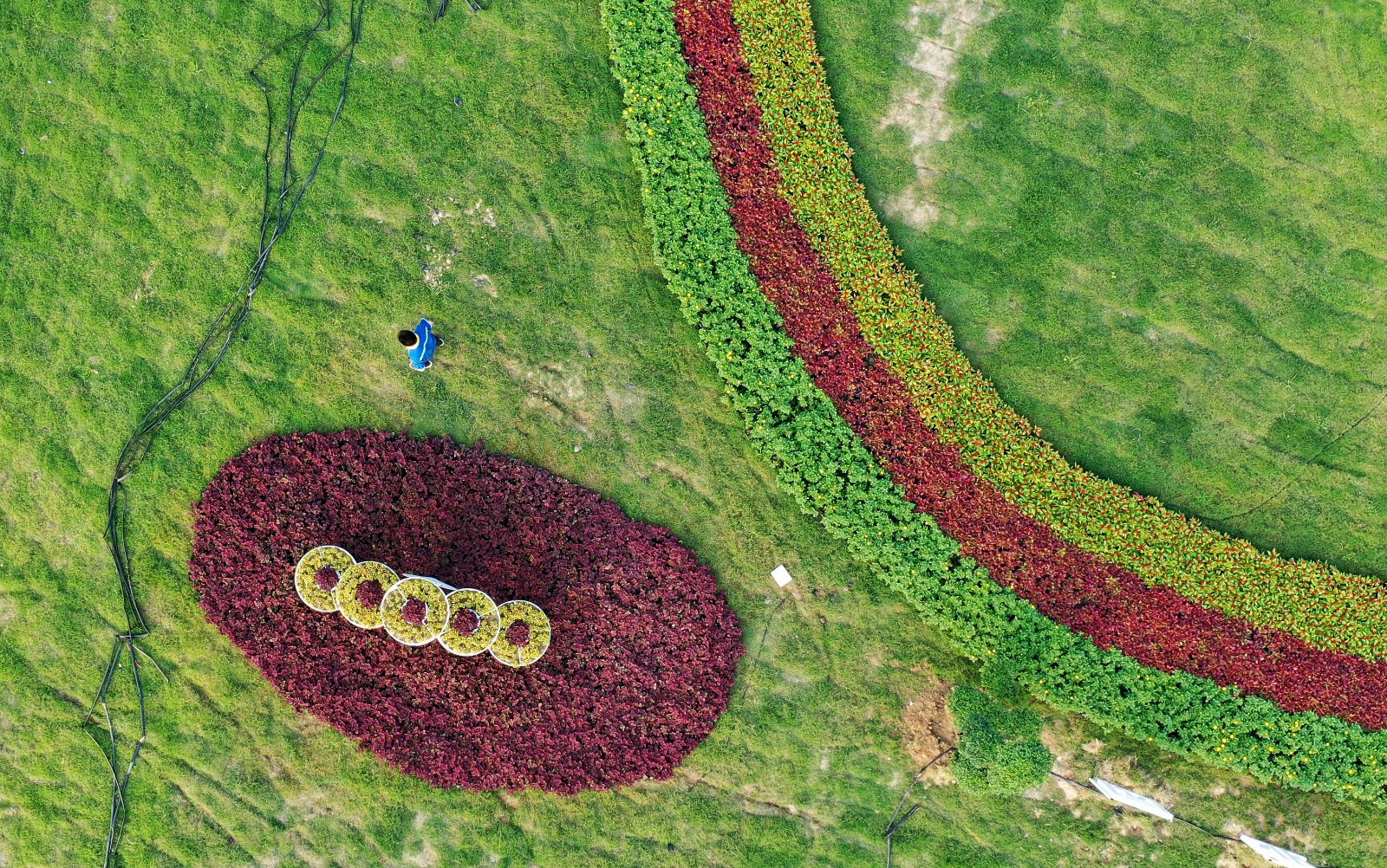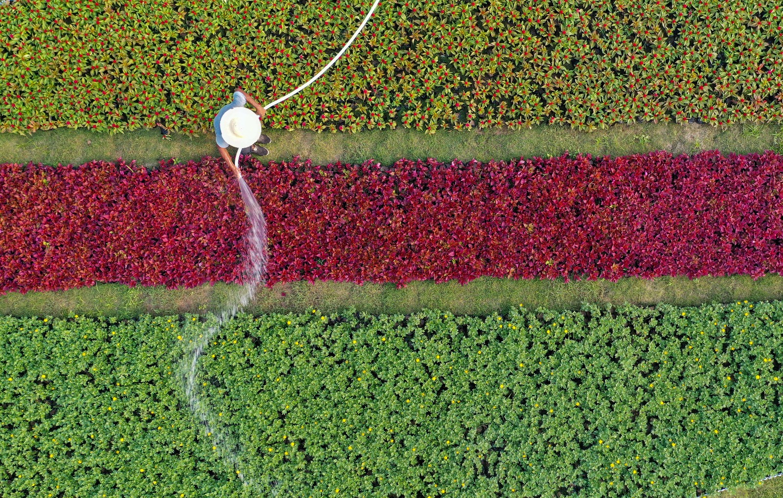 綠化工人正在養(yǎng)護(hù)花壇和草坪