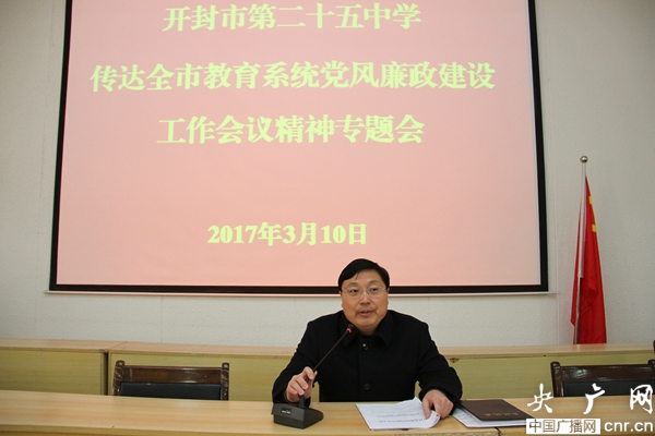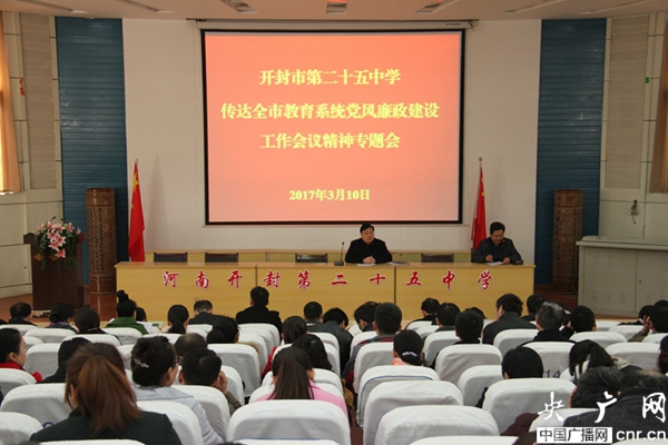央廣網(wǎng)河南分網(wǎng)3月12日消息 3月10日下午,開封二十五中在大報(bào)告廳召開全體教工大會(huì),傳達(dá)2017年全市教育系統(tǒng)黨風(fēng)廉政建設(shè)工作會(huì)議精神。宋立虎校長(zhǎng)傳達(dá)了市教育局黨組書記、局長(zhǎng)李尕果和局紀(jì)檢組組長(zhǎng)高憲臣的講話精神,通報(bào)了開封市教育系統(tǒng)一年來(lái)幾起典型案件的查處情況,為全校教職工上了一次生動(dòng)、深刻的警示教育課。宋校長(zhǎng)還總結(jié)了該校2016年黨風(fēng)廉政建設(shè)工作,安排了2017年的黨風(fēng)廉政建設(shè)任務(wù):一年來(lái),該校認(rèn)真學(xué)習(xí)貫徹黨的十八大、十八屆四中、五中全會(huì)、省十次黨代會(huì)、市十一次黨代會(huì)精神,扎實(shí)開展“兩學(xué)一做”學(xué)習(xí)教育,按照上級(jí)黨委的總體部署,不斷加強(qiáng)和改進(jìn)黨的思想、組織、作風(fēng)和制度建設(shè),形成了同心同德、共謀發(fā)展的堅(jiān)強(qiáng)領(lǐng)導(dǎo)集體,有力地促進(jìn)了學(xué)校各項(xiàng)工作的健康發(fā)展。堅(jiān)持黨員領(lǐng)導(dǎo)干部學(xué)習(xí)制度,真正把黨員領(lǐng)導(dǎo)干部的理論學(xué)習(xí)落到了實(shí)處;不斷加強(qiáng)黨員隊(duì)伍和教師隊(duì)伍建設(shè),提高教師隊(duì)伍整體素質(zhì),把黨建工作提高到一個(gè)新水平;校黨委還組織開展“學(xué)黨章黨規(guī)、學(xué)系列講話、做合格黨員”微型黨課系列活動(dòng)和主題黨課活動(dòng),建立黨建書屋(書柜、書架);組織部分黨員干部,赴蘭考焦裕祿紀(jì)念館學(xué)習(xí)參觀;組織各個(gè)支部在“兩學(xué)一做”學(xué)習(xí)教育中以“不忘初心,重溫入黨志愿”活動(dòng);積極開展“在職黨員到社區(qū)報(bào)到”活動(dòng)。2016年6月該校成為開封市首批四個(gè)黨史宣傳教育示范點(diǎn)之一。2017年,我們更要充分發(fā)揮校黨委的政治核心、戰(zhàn)斗堡壘、監(jiān)督保證作用和全體黨員的先鋒模范作用,不斷提高服務(wù)教學(xué)、服務(wù)師生的能力和水平,全面推進(jìn)學(xué)校建設(shè)、推動(dòng)學(xué)校發(fā)展。