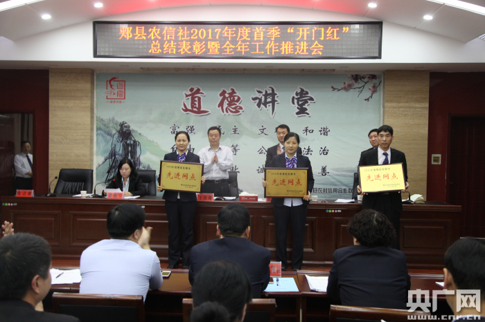 會上,首先由聯(lián)社副主任牛軍周通報了郟縣聯(lián)社2017年一季度業(yè)務(wù)經(jīng)營情況和秋冬季“清收風(fēng)暴”活動開展情況,并傳達了郟縣聯(lián)社2017年度業(yè)務(wù)經(jīng)營考核辦法,接著,由聯(lián)社黨委副書記、主任史克西同志宣讀了郟縣聯(lián)社2016年度表先決定和2017年“首季開門紅”工作表彰決定,之后,會議對先進部門、單位舉行了頒獎儀式,并邀請了兩位先進代表進行了總結(jié)分享,然后,各信用社主任向聯(lián)社黨委遞交了2017年度目標管理責(zé)任書。