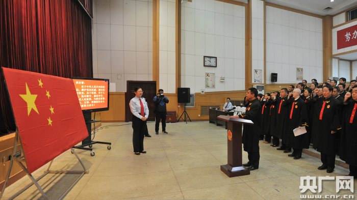在奏唱國歌后,58名員額法官在王偉院長的帶領(lǐng)下,身著法袍,面向國旗,舉起右拳,莊嚴宣誓;3名員額法官代表分別代表本單位作了表態(tài)發(fā)言。