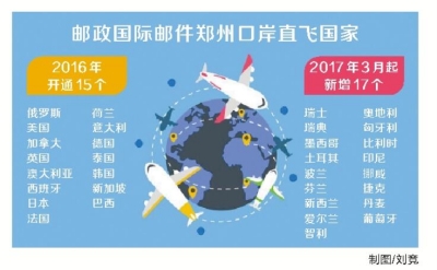 今年3月15日起,我省強力推進郵政國際郵件鄭州口岸建設(shè),新增17個直飛國家,至此共開通了至俄、美,英、法、德等32個國家的37條直航郵路,直飛后國際小包業(yè)務(wù)物流效率提升30%,有力支持了鄭州航空港的服務(wù)功能。