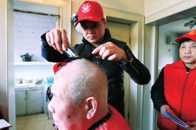 志愿者在為老人提供家庭服務(wù)。 記者洪波攝影