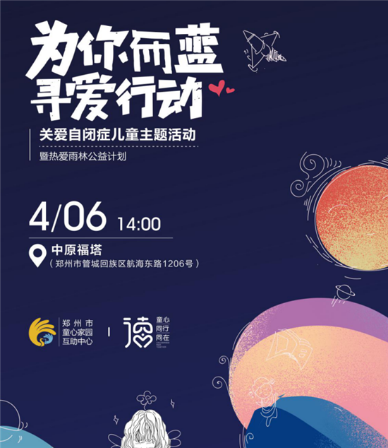 致公黨河南省委青年工作委員會、鄭州市僑聯青年委員會的海歸精英們作為志愿者將于4月6日下午2:00在中原福塔共同舉辦“為你而藍,尋愛行動——關愛自閉癥兒童主題活動”,呼吁全社會愛心人士關注自閉癥人士及其家庭,希望更多的人可以了解、接納自閉癥人士。