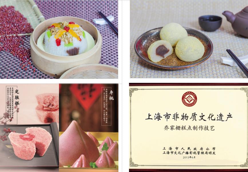 喬家柵核心產(chǎn)品分為團、圓、糕、粽四大類,寓意“團”“圓”“高”“中”,一年四季不同節(jié)氣都有相對應(yīng)的糕團,飽口福的同時也討了個好口彩。一直以來,喬家柵產(chǎn)品大多采用純手工制作,特別講究技藝的傳承。一個上好的蘇式月餅一切為二,數(shù)一數(shù)橫切面,從上到下最多可“起酥”三十六層。而喬家柵的百果松糕制作技藝更是精細和嚴(yán)格,將上等白元或陰元糯米和精選青浦白稻米為主料,摻和磨成干粉和廣西上等蔗糖,按一定比例混合包裹優(yōu)選大紅袍赤豆炒制成的豆沙,外皮軟化內(nèi)心香甜、口味細膩。最后還要加入瓜仁、核桃仁、紅棗、糖冬瓜等輔料,整個制作過程有浸泡、澆灑、磨粉、篩粉等幾十道工序,是傳統(tǒng)手工糕點的卓越代表。2015年,喬家柵糕點制作技藝項目,正式入選上海市非物質(zhì)文化遺產(chǎn)名錄。入選非遺是歷代喬府人共同努力的結(jié)果,也是喬家柵轉(zhuǎn)型發(fā)展的新起點。