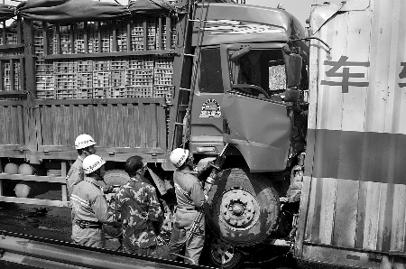 排在最后的掛車車頭因沖擊已嚴(yán)重變形,男司機(jī)右腿被卡在駕駛室內(nèi)。經(jīng)過近20分鐘的努力,消防隊(duì)員成功將其救出。目前,被困司機(jī)正在醫(yī)院治療,事故原因正在進(jìn)一步調(diào)查當(dāng)中。 (見習(xí)記者杜一格 通訊員黃夏夏文圖)