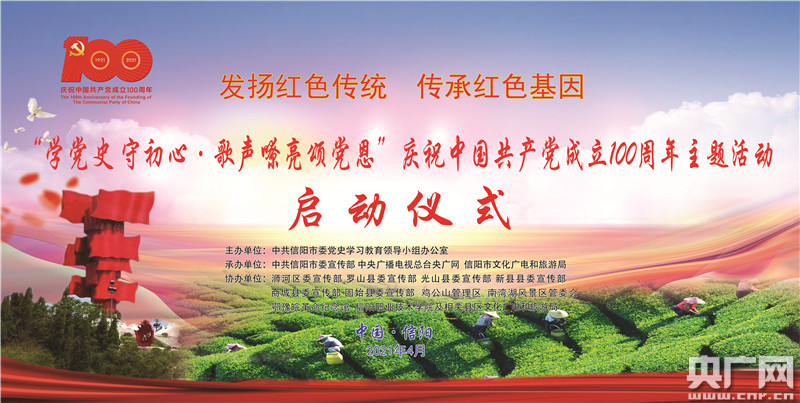 央廣網(wǎng)信陽4月21日消息(記者 王韶卿)4月21日,記者從中共信陽市黨史學(xué)習(xí)教育領(lǐng)導(dǎo)小組辦公室、信陽市委宣傳部了解到,為深入開展黨史學(xué)習(xí)教育,進(jìn)一步弘揚(yáng)大別山精神,由中共信陽市黨史學(xué)習(xí)教育領(lǐng)導(dǎo)小組辦公室主辦、市委宣傳部、信陽市文化廣電和旅游局、中央廣播電視總臺央廣網(wǎng)共同承辦的慶祝中國共產(chǎn)黨成立100周年“學(xué)黨史 守初心·歌聲嘹亮頌黨恩”系列主題宣傳活動啟動儀式將于4月23日在信陽鄂豫皖革命紀(jì)念館舉行。
