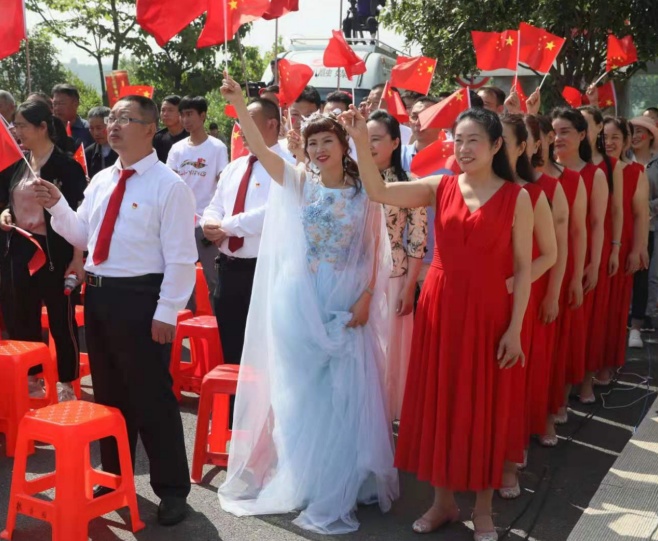 迎風(fēng)招展的紅旗映襯著觀眾如花的笑臉,再加上揮舞的手臂,現(xiàn)場(chǎng)氣氛熱烈而喜慶。