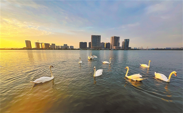 鄭州北龍湖中沐浴著美麗朝霞的天鵝。