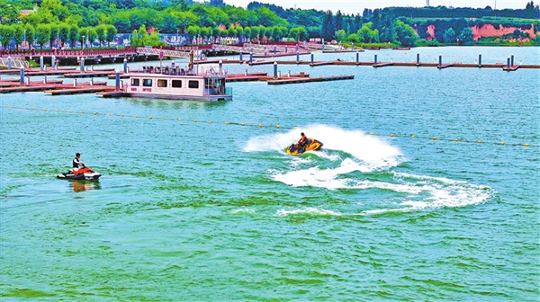 8月25日,位于洛陽(yáng)市孟津區(qū)西霞院街道東寨社區(qū)的“在河之洲·龐巴迪水上運(yùn)動(dòng)中心”對(duì)外開放,吸引大批游客前來(lái)親水乘涼。