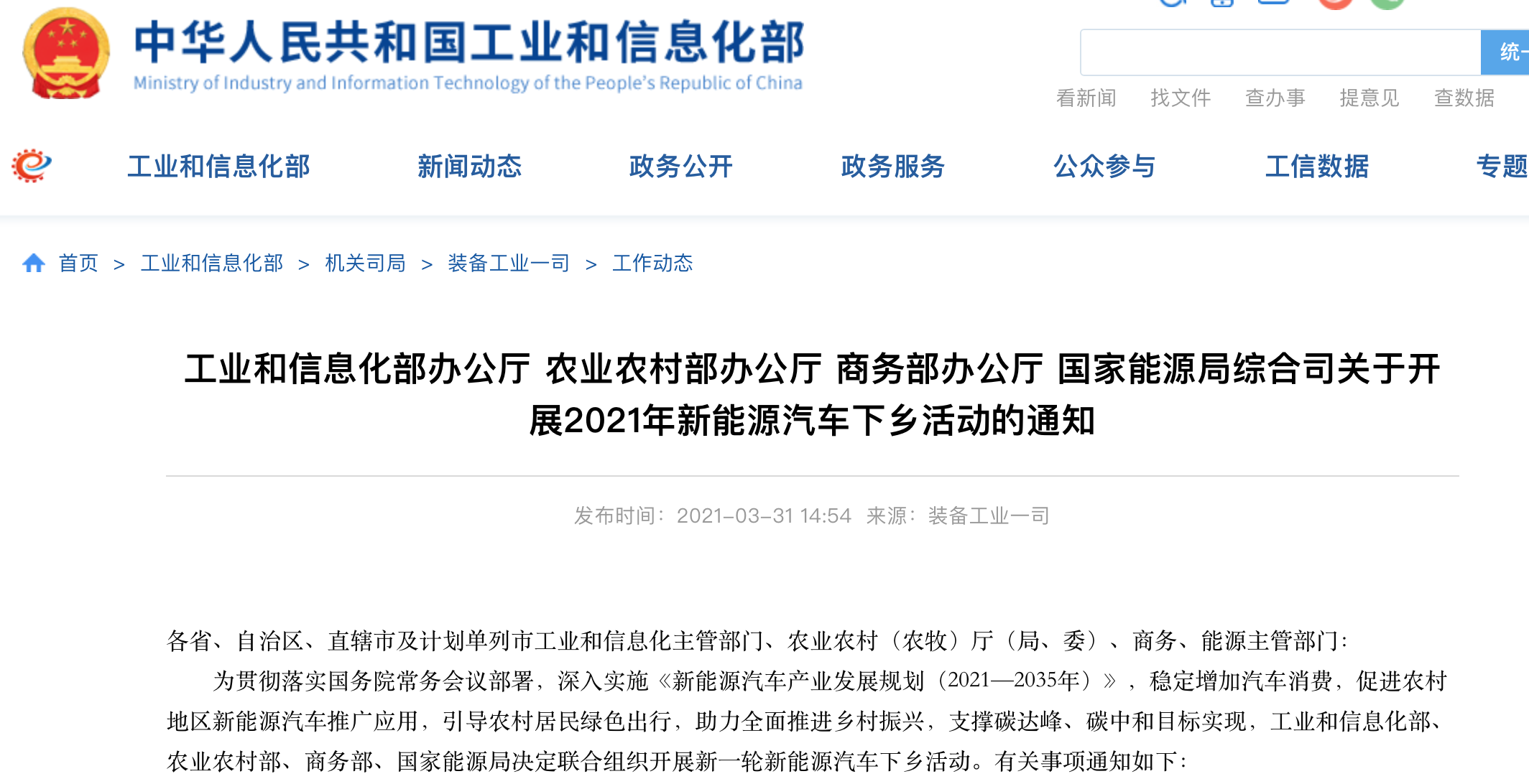 央廣網北京3月31日消息 (記者 于琦)31日,工業(yè)和信息化部發(fā)布公告稱,為貫徹落實國務院常務會議部署,深入實施《新能源汽車產業(yè)發(fā)展規(guī)劃(2021—2035年)》,穩(wěn)定增加汽車消費,促進農村地區(qū)新能源汽車推廣應用,引導農村居民綠色出行,助力全面推進鄉(xiāng)村振興,支撐碳達峰、碳中和目標實現(xiàn),工業(yè)和信息化部、農業(yè)農村部、商務部、國家能源局決定聯(lián)合組織開展新一輪新能源汽車下鄉(xiāng)活動。