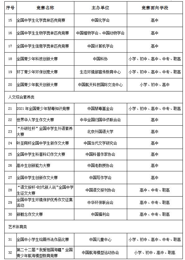 近日,教育部官網(wǎng)發(fā)布《教育部辦公廳關(guān)于公布2021—2022學(xué)年面向中小學(xué)生的全國(guó)性競(jìng)賽活動(dòng)的通知》,確定36項(xiàng)競(jìng)賽活動(dòng)為2021—2022學(xué)年面向中小學(xué)生的全國(guó)性競(jìng)賽活動(dòng),舉辦時(shí)間原則上為2022年8月前。要求學(xué)生和家長(zhǎng)堅(jiān)決不參加名單以外違規(guī)舉辦的競(jìng)賽活動(dòng),切實(shí)減輕學(xué)生過(guò)重課外負(fù)擔(dān)。