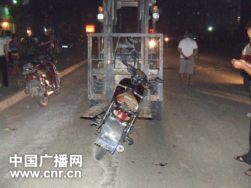 6月19日晚上9時(shí)許,河南省新密市公安局交警大隊(duì)三中隊(duì)中隊(duì)長(zhǎng)張利民接到報(bào)警,在杞密路馬士奇溝發(fā)生一起交通事故。張利民立即帶領(lǐng)民警張國(guó)順迅速出警,駕警車(chē)趕到事故現(xiàn)場(chǎng)。在公路東側(cè),一輛兩輪摩托車(chē)整個(gè)車(chē)身都鉆進(jìn)叉車(chē)的前面的叉子里,不能動(dòng)彈,旁邊還躺著穿著紅色上衣的男子,抱著受傷的右腿呻吟著。民警們趕忙將傷者抬上趕來(lái)的急救車(chē),送醫(yī)院救治。然后找來(lái)叉車(chē)司機(jī)進(jìn)行詢問(wèn)。叉車(chē)司機(jī)朱某稱(chēng),他駕著自家叉車(chē),由南向北方向靠路邊慢行,要去給別人干活,走到這里時(shí),這輛摩托車(chē)亮著大燈照著我的叉車(chē)沖了過(guò)來(lái),一頭鉆進(jìn)了叉子中間。勘查完現(xiàn)場(chǎng),民警們來(lái)到醫(yī)院,詢問(wèn)摩托車(chē)司機(jī)王某,王某說(shuō):當(dāng)時(shí)他由北向南駕兩輪摩托車(chē)回家,看路上車(chē)少左邊路面好,就逆向偏左邊走好路,走到這段公路時(shí),一束刺眼的燈光照射過(guò)來(lái),看燈光還以為是一輛摩托車(chē),想著等到跟前再避開(kāi)也不遲,當(dāng)?shù)礁安虐l(fā)現(xiàn)是輛叉車(chē),還沒(méi)來(lái)得及繞開(kāi),就被叉車(chē)伸出的叉子卡住,整個(gè)車(chē)身就鉆進(jìn)了兩個(gè)叉子中間,像被“螃蟹卡”夾住一樣不能動(dòng)彈,右腿褲子被掛爛,大腿被擦傷,現(xiàn)在還疼得受不了。目前,此事故正在進(jìn)一步調(diào)解處理中。(通訊員:申建中 方亞娟)