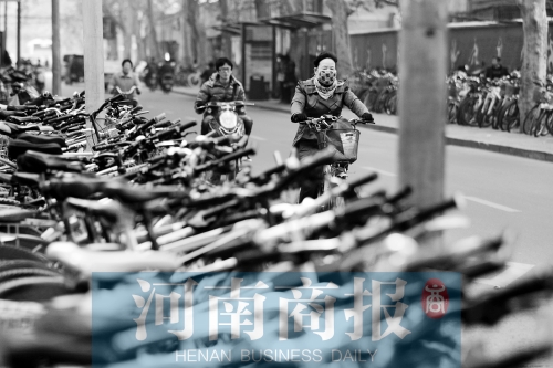數(shù)天前的鄭州市金水路,一名市民戴著口罩在霧霾中騎行,約兩公里外的高樓,已幾乎看不清 (記者 唐韜/攝)