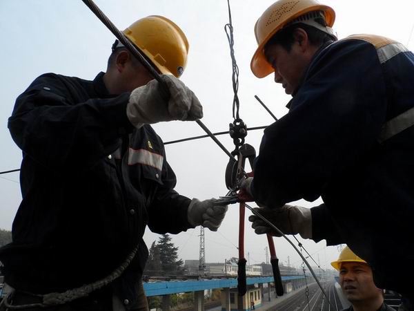 (圖為該段職工正在更換接觸網(wǎng)定位斜吊線)