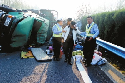 10月10日6時(shí)許,商丘市公安局高速交警大隊(duì)二中隊(duì)接到群眾報(bào)警稱,一輛貨車在連霍高速公路306公里處側(cè)翻,司機(jī)受傷被卡。民警迅速趕到事故現(xiàn)場,發(fā)現(xiàn)一輛車牌號為滬BX12×××的大貨車側(cè)翻在快車道上,中央防護(hù)欄被撞斷,所運(yùn)載的汽車配件傾倒在路面上。司機(jī)卡在駕駛室內(nèi),滿臉是血,不停地痛苦呻吟。緊急關(guān)頭,民警邊設(shè)置警戒和聯(lián)系120急救車,邊緊急搶救受傷司機(jī)。最終,民警和過往司機(jī)一起,將被卡司機(jī)救出(如上圖)。民警發(fā)現(xiàn)司機(jī)眼部周圍受傷流血,急忙拿出藥用紗布敷在司機(jī)的傷口上,并快速送上警車,決定與未趕到的救護(hù)車接力護(hù)送病人。民警經(jīng)過與120急救中心溝通,雙方在中途會(huì)合。
