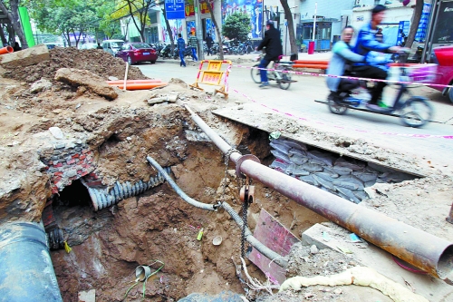 除了半幅道路被占用,政七街東側(cè)的人行道和西側(cè)的部分人行道也被挖開,大坑小坑隨處可見!跋仁请娏,又來了熱力,現(xiàn)在,他們已在此施工一個半月了,行車?yán)щy,塵土飛揚,生意更是沒法做!备浇戆l(fā)店工作人員說。記者注意到因道路被“開腸破肚”,施工方放了兩塊鐵板讓人通行,扯了兩根布條就算防護和提醒了。