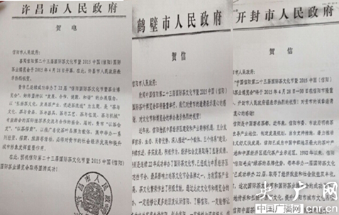 河南多地市政府發(fā)來賀電賀信慶祝茶文化節(jié)盛典