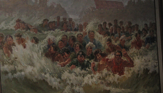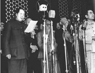 毛澤東在北京天安門城樓上宣告中華人民共和國、中央人民政府成立了。