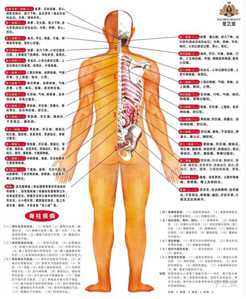 脊柱在人的生命活動(dòng)中具有決定的作用,一旦其發(fā)生異常改變,人體就會(huì)做出相應(yīng)的反應(yīng)。因此,脊柱是很多疾病發(fā)生的關(guān)鍵,也是造成很多慢性病和疑難病的原因。脊柱相關(guān)疾病就是由于脊柱力學(xué)不平衡而致肌張力失衡,骨關(guān)節(jié)輕度位移,壓迫周圍血管神經(jīng),其所支配部位的神經(jīng),血管及臟器就會(huì)出現(xiàn)功能異常改變,腦部和身體各部的信息傳達(dá)也將會(huì)受阻,并由此產(chǎn)生病變引起的身體其他部分的相應(yīng)癥狀和體征。