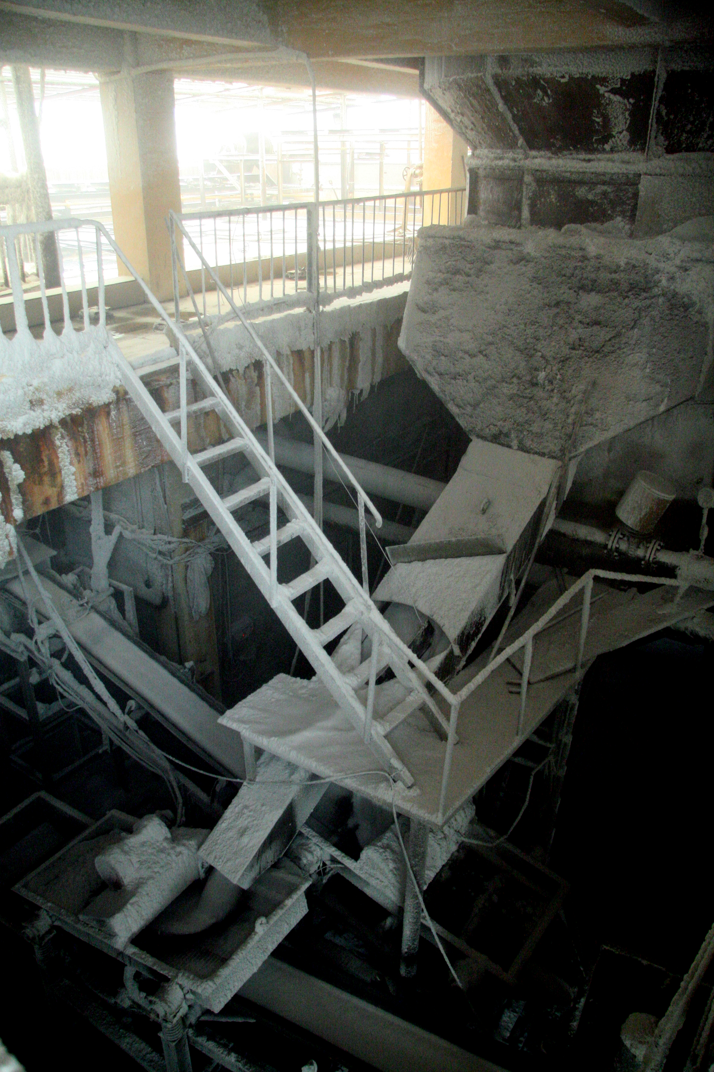 固體雜質顆粒經(jīng)過粉碎后,直接進入運輸管道到達工業(yè)鹽的堆放倉庫,工作人員有序的進行分工包裝成袋。