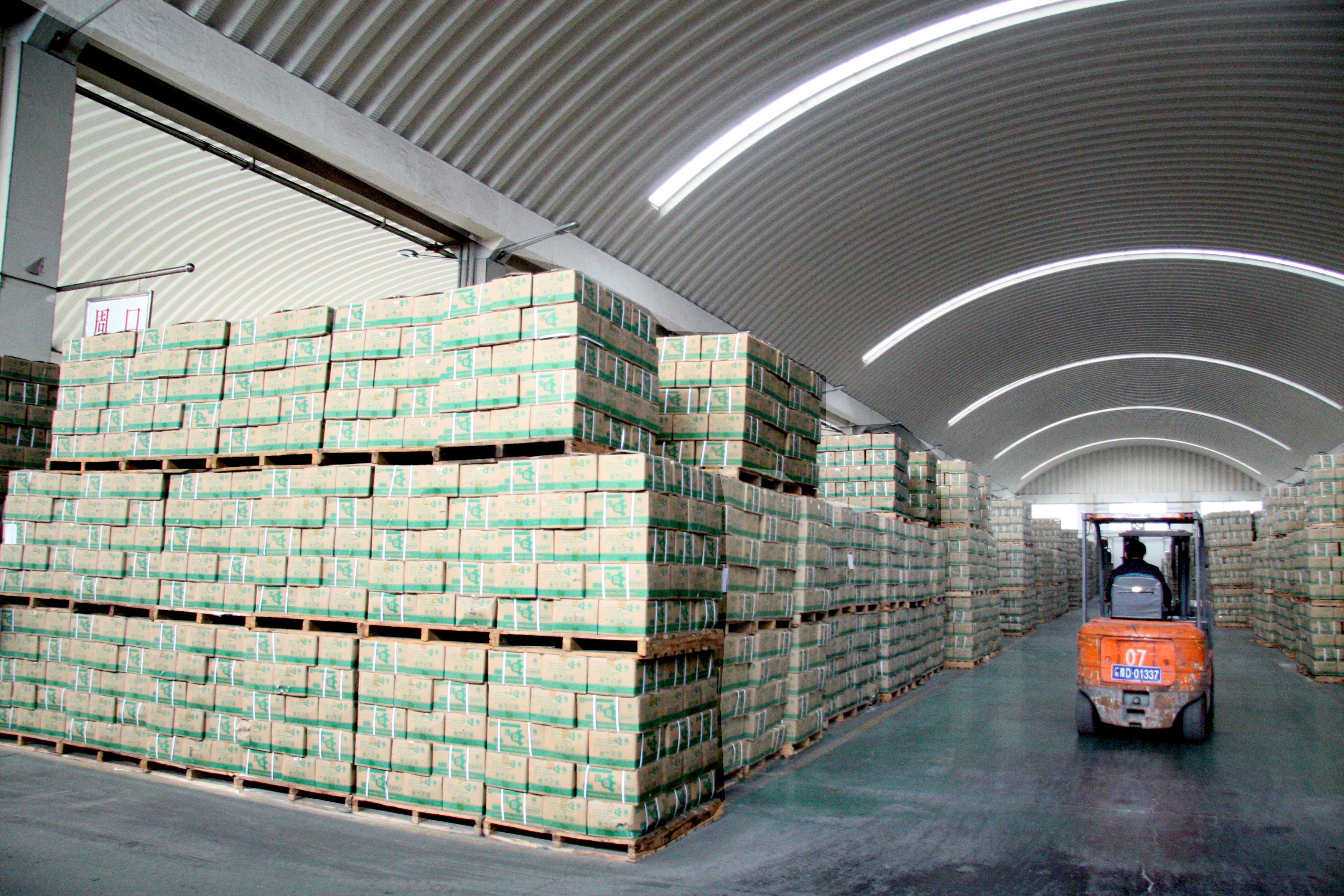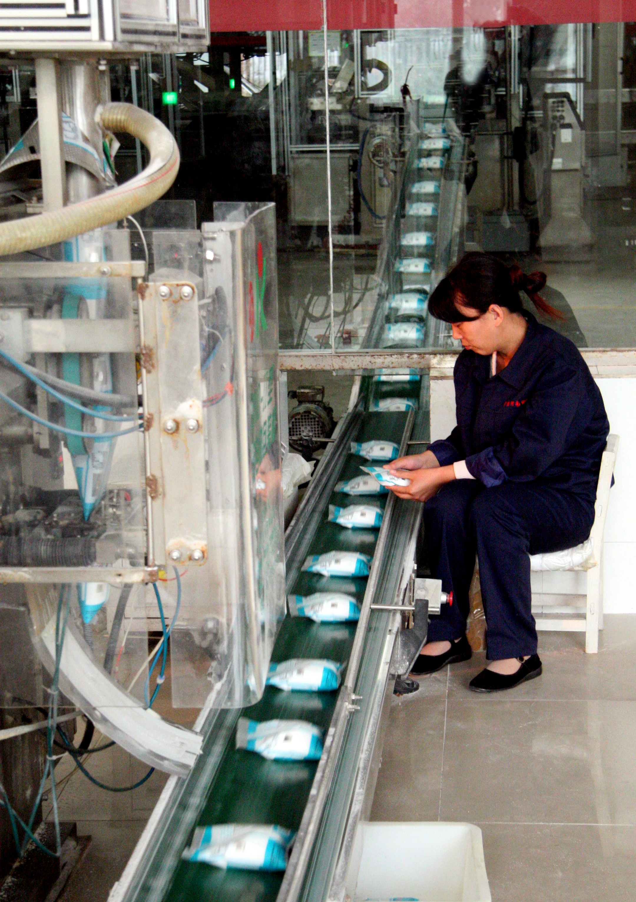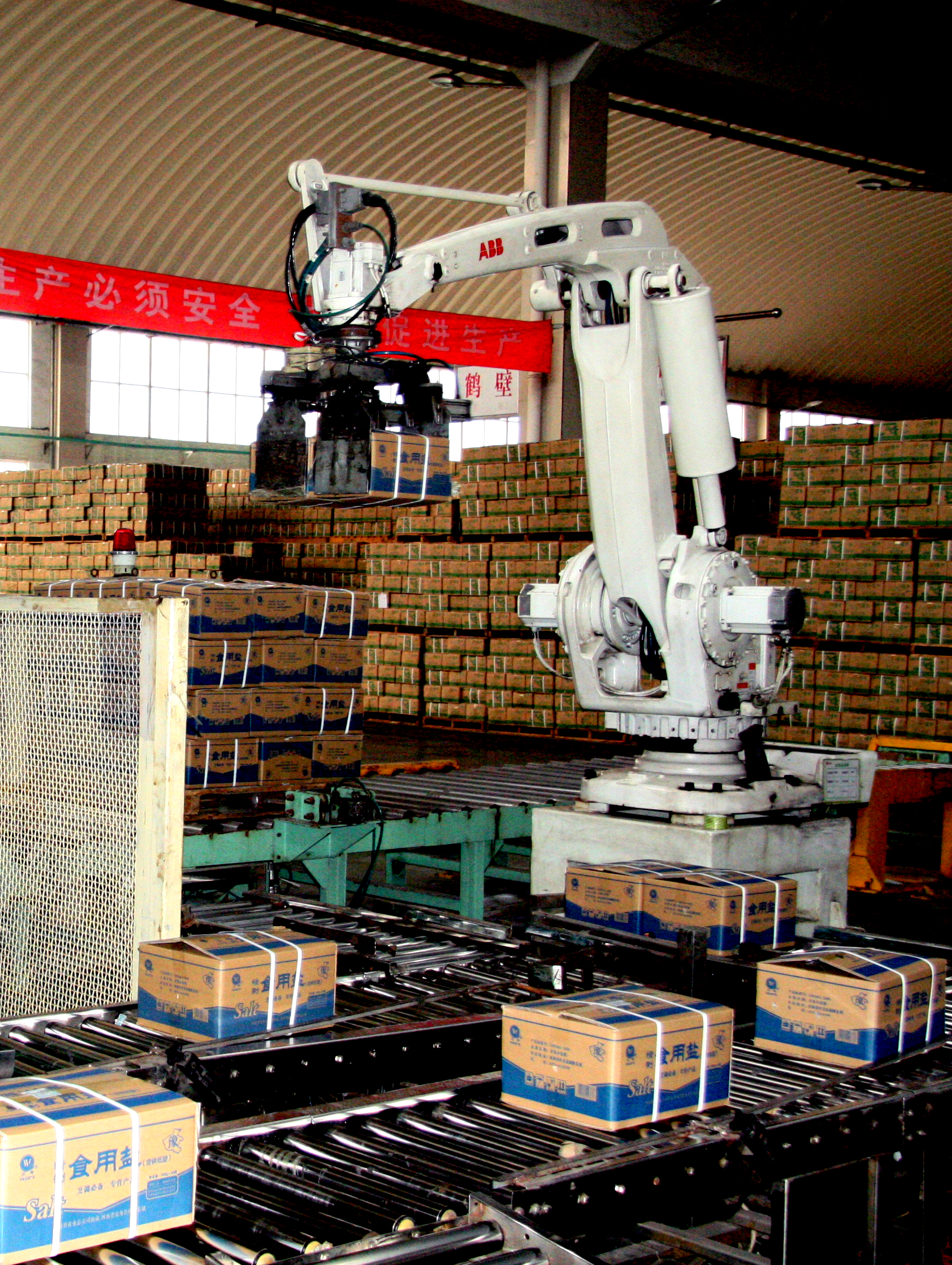 包裝成袋的食用鹽通過輸送帶進行裝箱