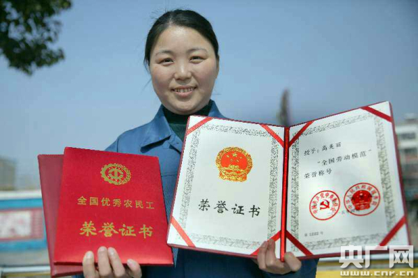 高美麗的付出得到了社會各界的認可,2008年11月,國務院農民工工作聯(lián)席會上,她有幸被授予“全國優(yōu)秀農民工”稱號。2009年,作為“全國優(yōu)秀農民工”四人代表之一,登上了國慶60周年觀禮臺,受到了黨和國家領導人的親切接見。