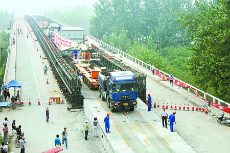 特高壓南陽(yáng)站擴(kuò)建工程第三臺(tái)主變壓器順利通過(guò)周口東沙河“橋上橋”。徐強(qiáng) 攝