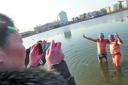 當(dāng)天下午2時,帝湖邊擠滿參加活動的冬泳愛好者,先做熱身、準(zhǔn)備下水……下午3時,冬泳活動正式開始,人們先砸開厚約10厘米的冰層,但200平方米的水面容不下太多的冬泳者,愛好者們只得分批下水。展示泳技,歡樂游戲,拍照留影,活動一直持續(xù)到下午近6時。
